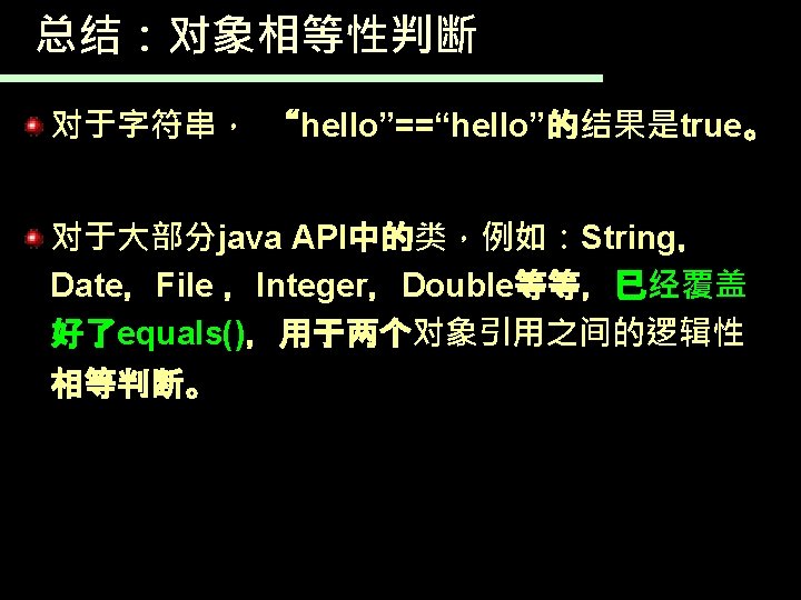 String str 1=new String("hello"); String str 2=new String("hello"); String str 3=str 1; //两个变量指向同一个字符串对象 false ?str 1==str 2 ?str 1. equals(str 2) true ?str 1==str 3 true ?str 1. equals(str 3) true ?"hello"=="hello“ true ?new String(“hello”)==new String(“hello”) ?false