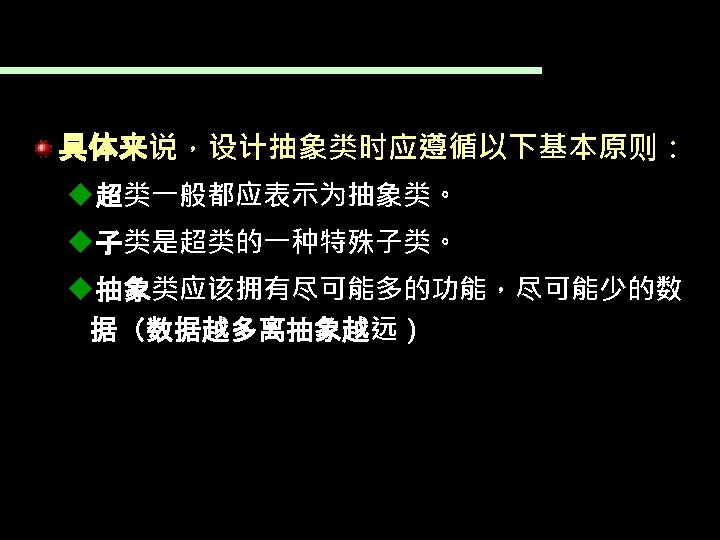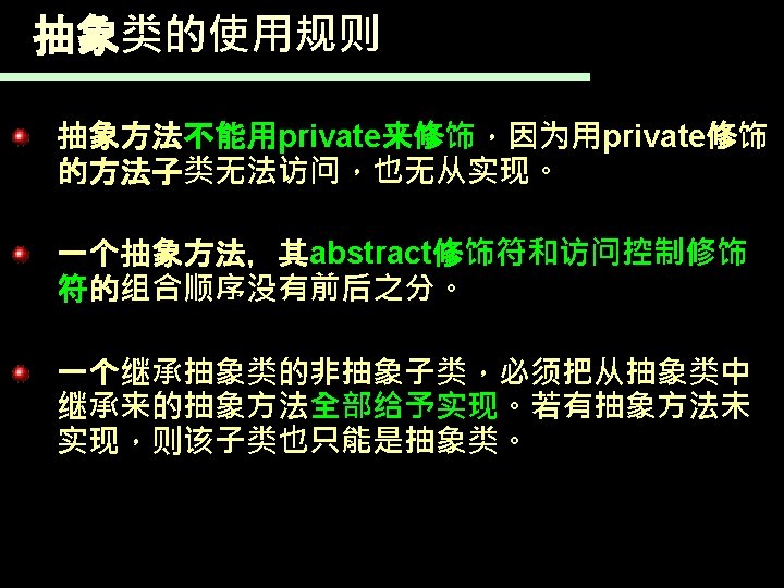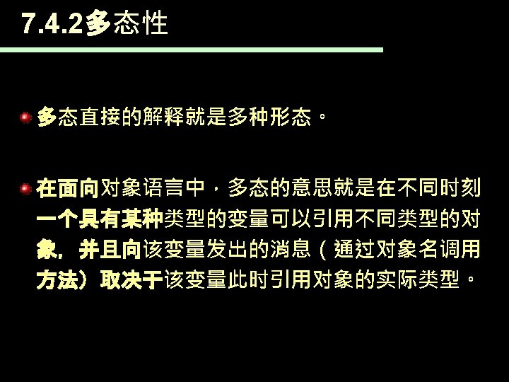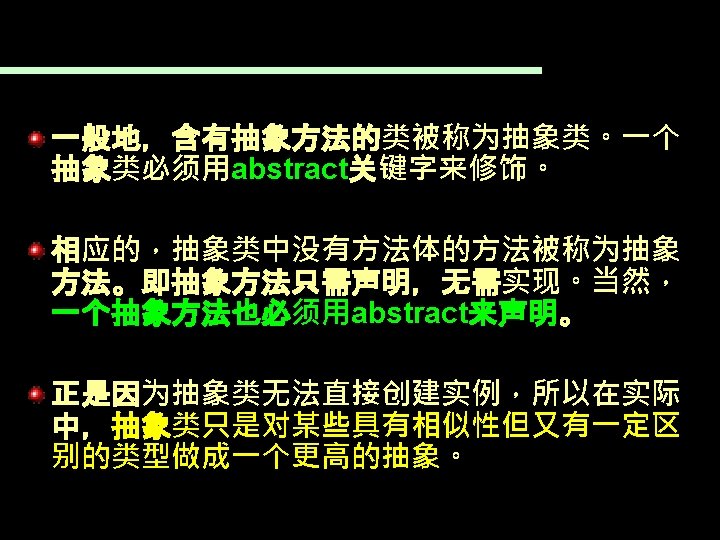 7. 3. 2抽象类 如下面的类就是一个抽象类: public abstract class Geometric. Figure{ String color; String get. Color(){ Return this. color; } public abstract double get. Area(); }