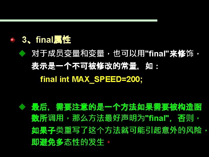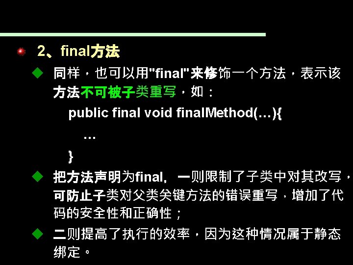 7. 3. 3 final 1、final类 可以用“final”声明一个类不可再被作为超类 如: public final class Final. Class{ … }