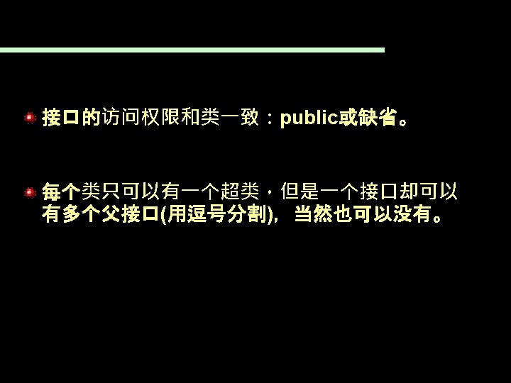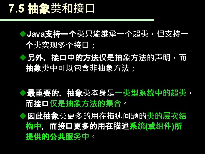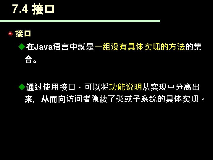 7. 4 接口 下面是声明接口的语法: [public] interface Interface. Name [extends Super. Interface 1 [, …]]{ 常量声明; type method. Name 1(…); type method. Name 2(…); }
