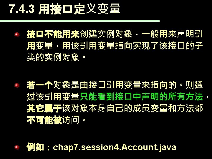 7. 4. 3 用接口定义变量 List accounts = null; accounts = new Array. List(); accounts = new Linked. List ();