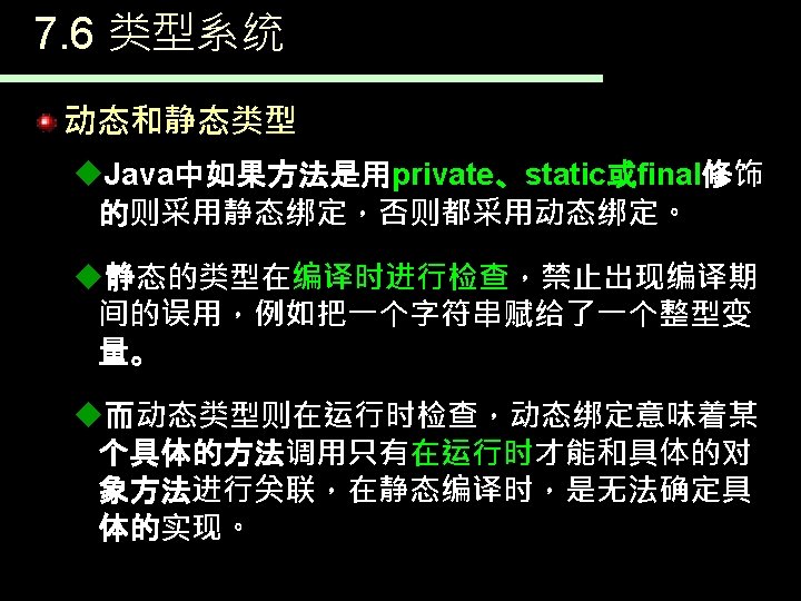 JAVA语言 漳州师院 许晴媛 动态绑定例子 public class Binding. Tester { public static void main(String[] args) l 说明 Øl编译的时候是无法知道s 运行结果 数组元素的具体类型到 Square. draw() 底是什么 Triangle. draw() { Shape[] s = new Shape[9]; int n; Circle. draw() for(int i = 0; i < s. length; i++) Ø 运行的时候才能确定究 Triangle. draw() { n = (int)(Math. random() * 3); 竟是什么类型,所以是 Triangle. draw() switch(n) 动态绑定 Circle. draw() { case 0: s[i] = new Circle(3) ; break; Square. draw() case 1: s[i] = new Square(4) ; break; Ø 在主方法的循环体中, Circle. draw() case 2: s[i] = new Rectangle(4, 3) ; 每次根据运行时产生的 Triangle. draw() } //switch 随机数生成指向一个 }//for Circle、Square或者 for(int i = 0; i < s. length; i++) s[i]. get. Area(); Rectangle的引用,所 }} 以每次运行都可能有不 同的结果