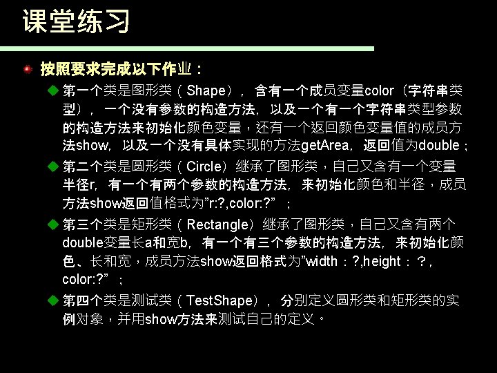 JAVA语言 漳州师院 许晴媛 抽象类和抽象方法例子 public abstract Shape { static final double PI=3. 14; public abstract double get. Area(); }