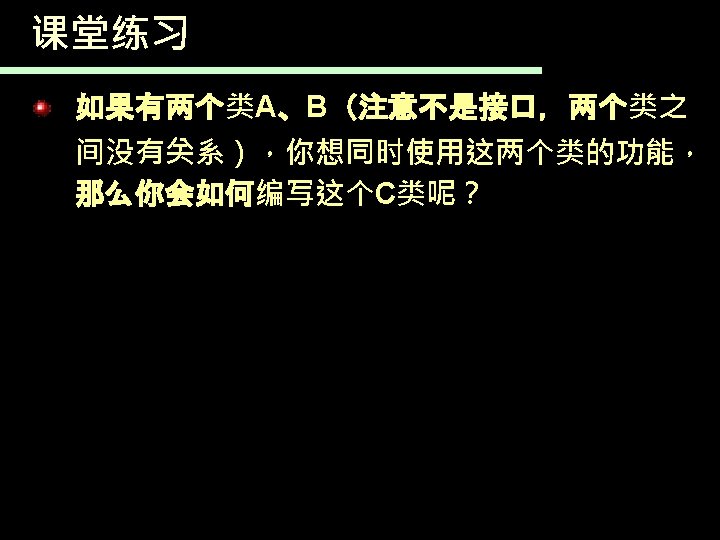 课堂练习 public class A{ public void a 1(){ public void a 2(){ } } } public class B{ public void b 1(){ public void b 2(){ } } } public class C{ private A a=new A(); private B b=new B(); public void a 1(){ a. b 1(); } public void a 2(){ a. b 2(); } public void b 1(){ b. b 1(); }; public void b 2(){ b. b 2(); }; }
