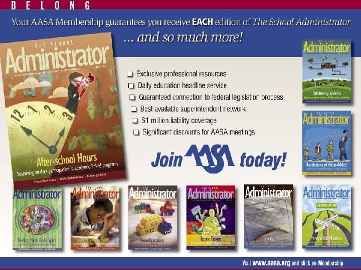 About AASA • Professional organization for 13, 000 school system leaders and superintendents – Also professors of educational administration and aspiring school system leaders • Mission: to support and develop effective school system leaders who are dedicated to the highest quality public education for all children • Stand Up for Public Education™ initiative to support public education as the heart of our democracy