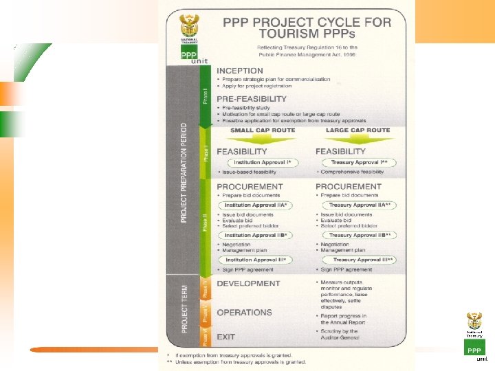 POSSIBLE EXEMPTIONS FROM TREASURY APPROVALS • • Treasury Regulation 16. 10. 1 Proviso’s: institutional capacity and internal application of the criteria of affordability, value for money and risk transfer (in-house approvals process) • Exemptions most likely for small cap tourism PPPs • May be given for large cap tourism PPPs if institutional experience and capacity has been established