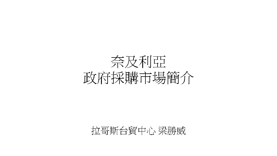 政府採購法規 • Public Procurement Act, 2007 • 公共採購局 Bureau of Public Procurement (https: //www. bpp. gov. ng/) • 投標基本必要文件: 1. CAC Business Registration Certificate 2. NSITF (National Social Insurance Trust Fund) Compliance Certificate 3. ITF (Industrial Training Fund) Certificate: 雇用 5人以上,或是雇用 5人 以下但年營收超過5千萬奈拉之企業,需繳交員 總薪資之1% 4. PENCOM (National Pension Commission) Compliance Certificate 5. BPP Federal Contractor Certificate • Tax Clearance certificate