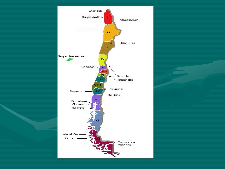 huilliches • Poblaron desde el río Toltén hasta el seno del Reloncaví. ( Osorno, Llanquihue y Valdivia) • Su lengua se parecía a la de los mapuches y se llamaba Ste Sungun. • No era un pueblo guerrero, sino se dedicaban al cultivo de maíz y papas. Además a la crianza de guanacos y huemules. • Vivían en construcciones parecidas a las rucas.