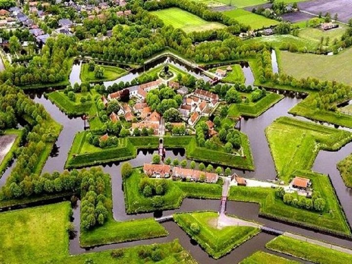 Villa Bourtange, Holanda Un pueblo con forma de estrella Hay muchos, pero quizás sea éste uno de los más bonitos pueblos fortificados. Su forma se debe a un optimizado diseño defensivo, una plantilla muy utilizada en distintas construcciones de la Europa Medieval.