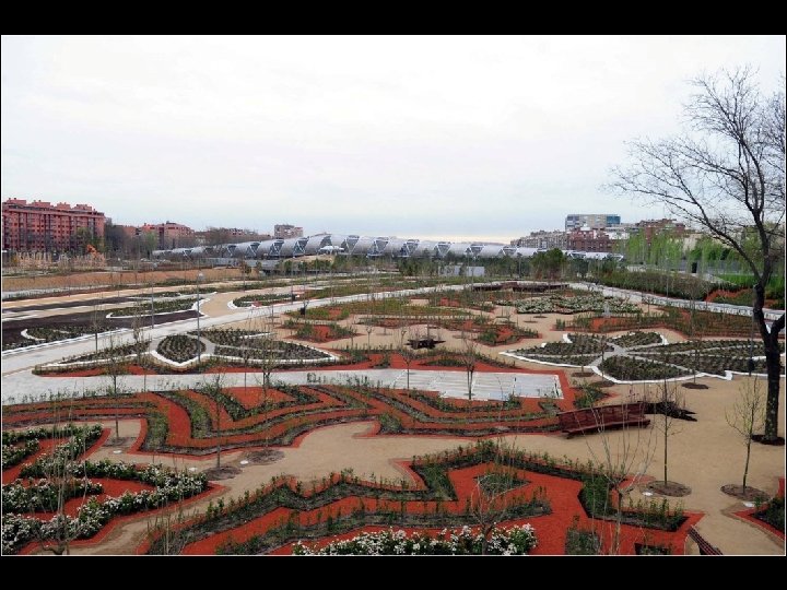 Consta de dos conos helicoidales, a base de aros concéntricos, que confluyen diagonalmente en una loma artificial, aunque sin llegar a tocarse. Este promontorio ha sido diseñado con una doble función: por un lado, servir de mirador y, por otro, facilitar el acceso al parque inferior, a través de una serie de caminos que descienden hasta los jardines.