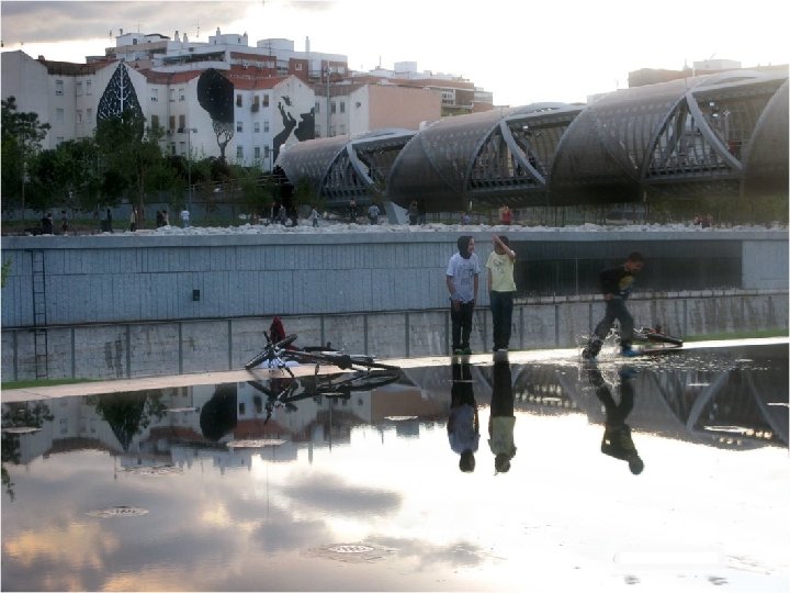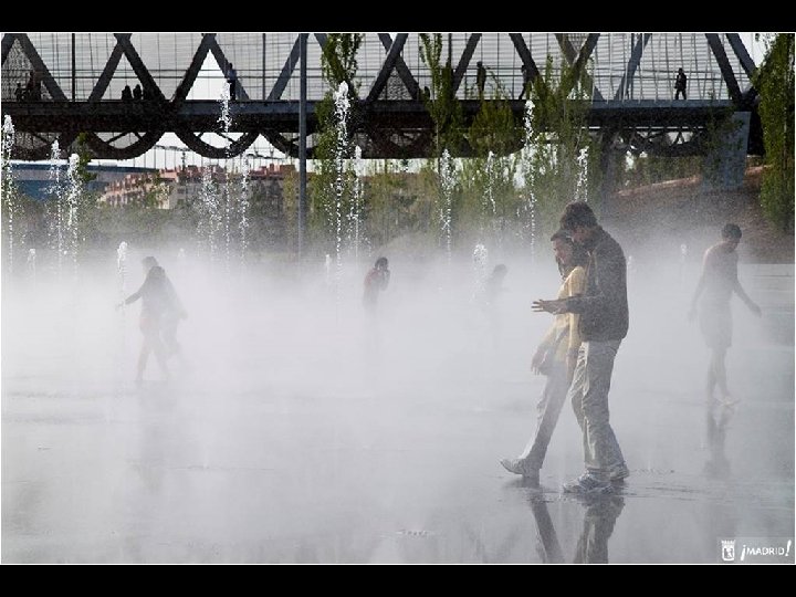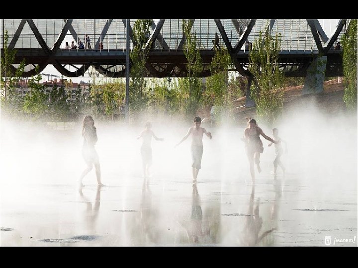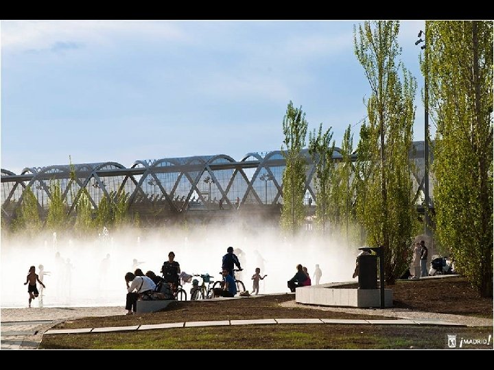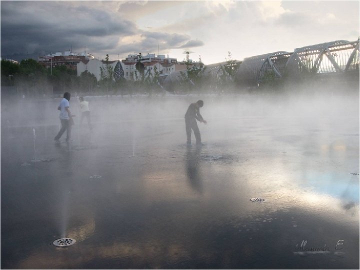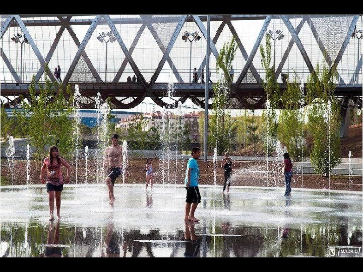 Está constituida por tres recintos acuáticos de forma ovalada en los que se alternan tres efectos diferentes: lámina superficial, donde los usuarios pueden tenderse y remojarse; chorros de agua de altura y efectos cambiantes, capaces de producir diferentes efectos, y nubes de agua pulverizada. Las zonas de descanso y estancia, con más de 6. 500 metros cuadrados de superficie y casi 300 árboles, completan el ámbito de la playa urbana.