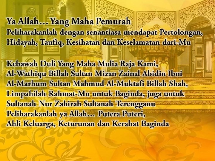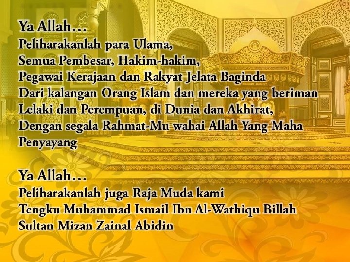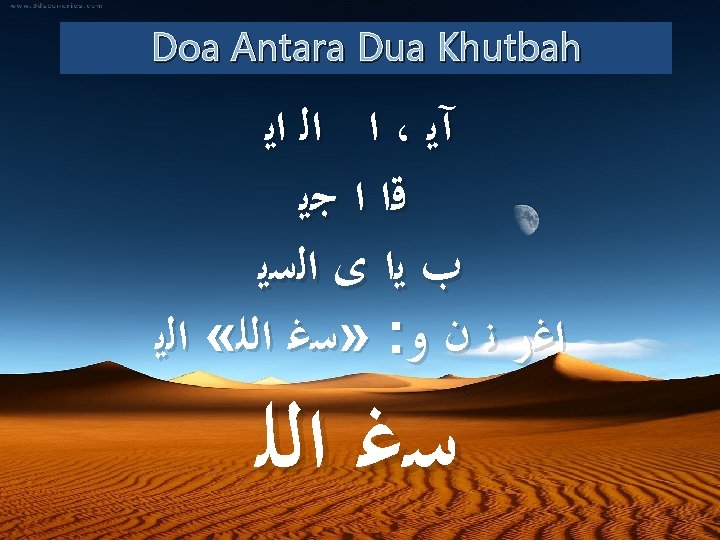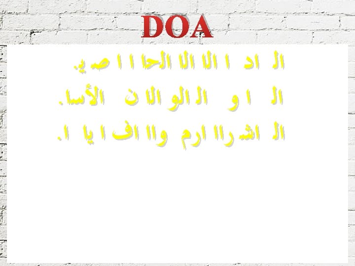 DOA ﺍﻷﺣﺍ ﻧﻡ ، ﺍﻟﺳﻳ ﺍﻟﺳﺍ ، ﺍﻟ ﺍﻏﺭ ﻟﺅﻳ ﺍﻟﺅﺍ ، ﺍﻷﻣﺍﺕ ﻳ ﻳ ﻳ ﺍﻟ ﺍ Ya Allah, ampunkanlah dosa golongan Muslimin dan Muslimat, Mukminin dan Mukminat, sama ada yang masih hidup atau yang telah meninggal dunia. Sesungguhnya Engkau Maha Mendengar dan Maha Memakbulkan segala permintaan