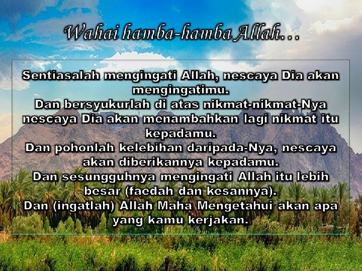 Pesanan Taqwa ﻯ ﺍﻟﻠ ﺍ ، ﺍ ﻭﺍ ﺍﻟﻠ Sama-samalah kita tingkatkan ketakwaan dan ketaatan kepada Allah, lebih-lebih lagi dalam tempoh yang mencabar ini. Jauhilah dosa maksiat yang boleh mengundang kemurkaan Allah, mudah-mudahan kita beroleh keampunan