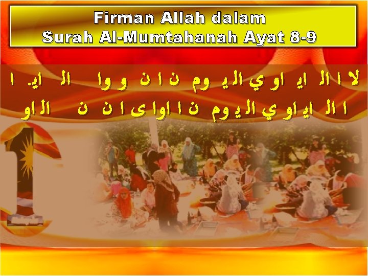 Firman Allah dalam Surah Hujurat Ayat 13 ﻧ ﺍﻟﻠ ﺍ ﺍ ﺍ ﺍﻟ ﺍ ﺇ ﺍ ﺍﻡ ﻥ ﻧﻯ ﺍ ﻭﺍ ﺍ ﺍﻭﺍ ﺍﻟﻠ ﻳ ﻳ Wahai umat manusia! Sesungguhnya kami menciptakan kamu dari lelaki dan perempuan, dan Kami telah mendirikan kamu berbagai bangsa dan bersuku puak, supaya kamu berkenalan (dan beramah mesra antara satu dengan yang lain). Sesungguhnya semulia-mulia kamu disisi Allah ialah orang yang lebih taqwanya di antara kamu, (bukan yang lebih keturunan atau bangsanya). Sesungguhnya Allah Maha Mengetahui, lagi Maha Mendalam Pengetahuan. Nya (akan keadaan dan amalan kamu)