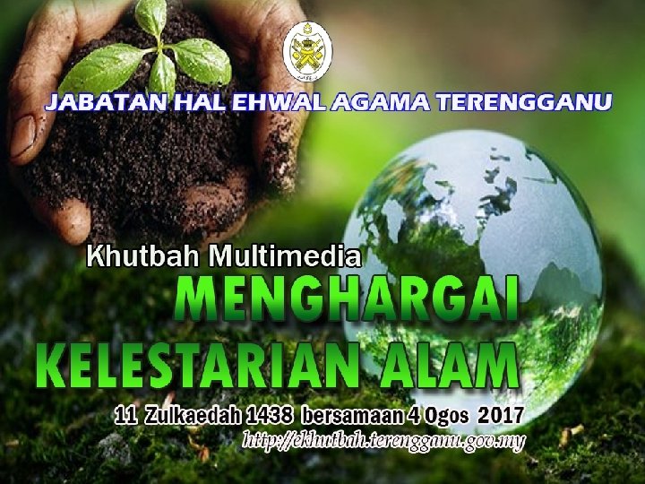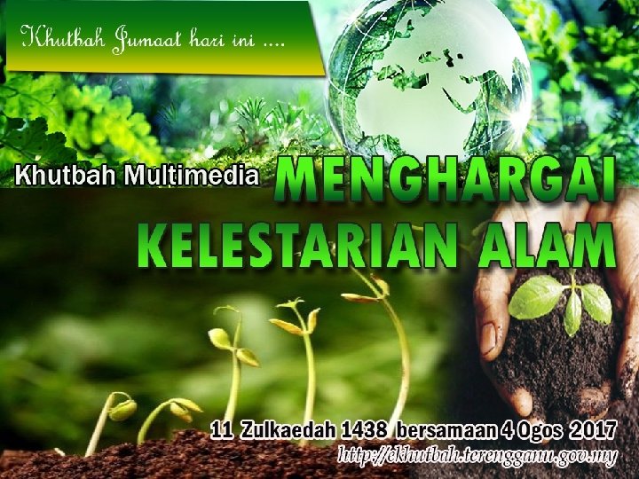 INTISARI KHUTBAH JUMAAT PADA 03/08/2017 TAJUK: “MENGHARGAI KELESTARIAN ALAM” 1. SYUKUR KEPADA ALLAH KERANA ANUGERAH ALAM YANG BUKAN SAHAJA MENCERMINKAN KEBESARAN DAN KEBIJAKSANAANNYA TAPI MENJADI FAKTOR KEHIDUPAN MANUSIA. 2. YANG LEBIH PENTING LAGI, DENGAN KEAJAIBAN CIPTAAN ITU, MANUSIA MUDAH MENERIMA KEIMANAN DAN MENYEDIAKAN BEKALAN UNTUK KEHIDUPAN YANG ABADI. 3. CIPTAAN ALLAH ITU JUGA MENDORONG MANUSIA AKUR DAN MENERIMA AMANAH MENGIMARAHKAN DAN MELESTARIKAN ALAM SUPAYA TERUS BERFUNGSI MENYUMBANG MANFAAT KEPADA KEHIDUPAN SELURUHNYA. 4. ALAM KURNIAAN ALLAH MESTI DIKEKALKAN KELANGSUNGANNYA DENGAN : i. BERSYUKUR DENGAN MENGEKAL DAN MEMBANGUNKAN POTENSINYA. ii. MENERIMA HAKIKAT BAHAWA PEMULIHARAANYA ADALAH TUNTUTAN AGAMA. iii. TIDAK MENCEMARKANNYA KERANA ITU ADALAH MAKSIAT.