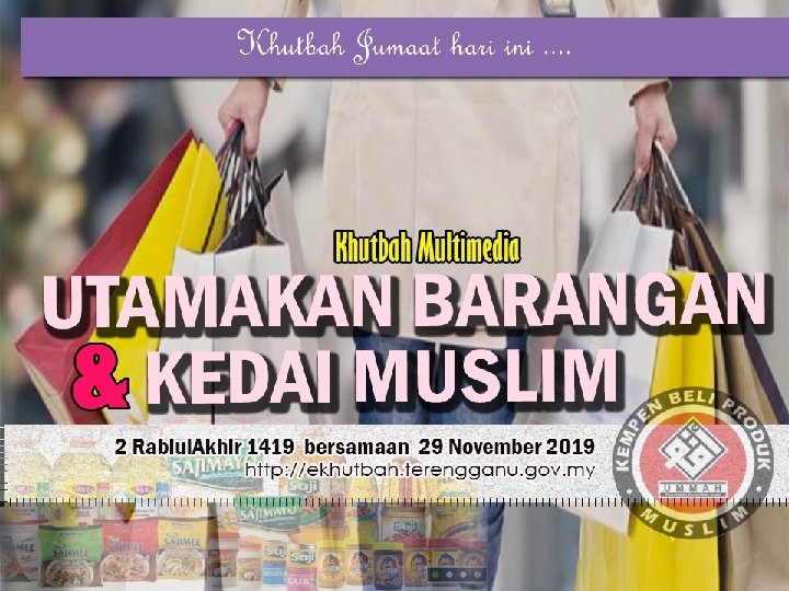 Intisari Khutbah Jumaat 29 November 2019 Tajuk: UTAMAKAN BARANGAN DAN KEDAI MUSLIM 1. MEMBINA KEKUATAN UMMAT DALAM SEMUA ASPEK ADALAH PERINTAH ALLAH. SALAH SATU KEKUATAN YANG PERLU DIKUASAI UMMAT IALAH EKONOMI. JIKA TIDAK, UMMAT ISLAM DIJAJAH DARI SEGI EKONOMI DAN TERUS BERADA DIBAWAH TELUNJUK KUASA- KUASA EKONOMI NON-MUSLIM 2. SETIAP INSAN PERLUKAN PRODUK UNTUK DIMAKAN ATAU DIGUNAKAN. JIKA UMMAT TIDAK MENGUASAI EKONOMI SUDAH PASTI MEREKA TERDEDAH KEPADA UNSUR-UNSUR HARAM. OLEH ITU, BAGI MENUTUP PINTU HARAM, PRODUK-PRODUK MESTI DIHASIL DAN DIKUASAI OLEH ISLAM.