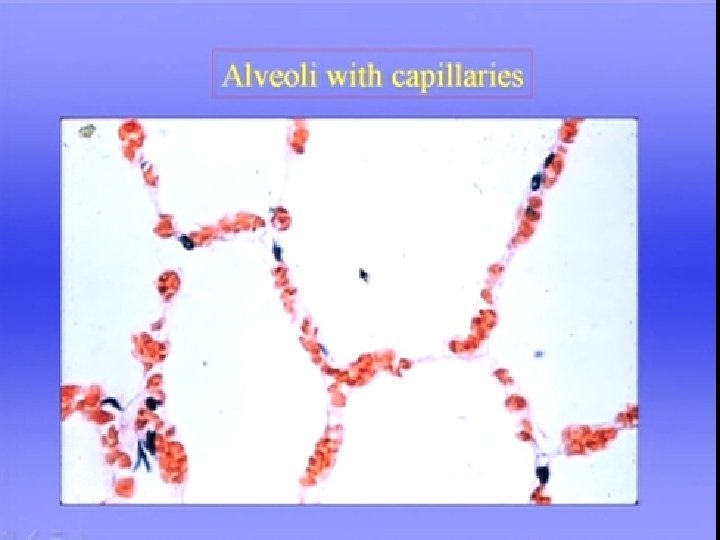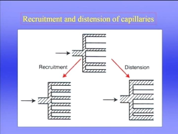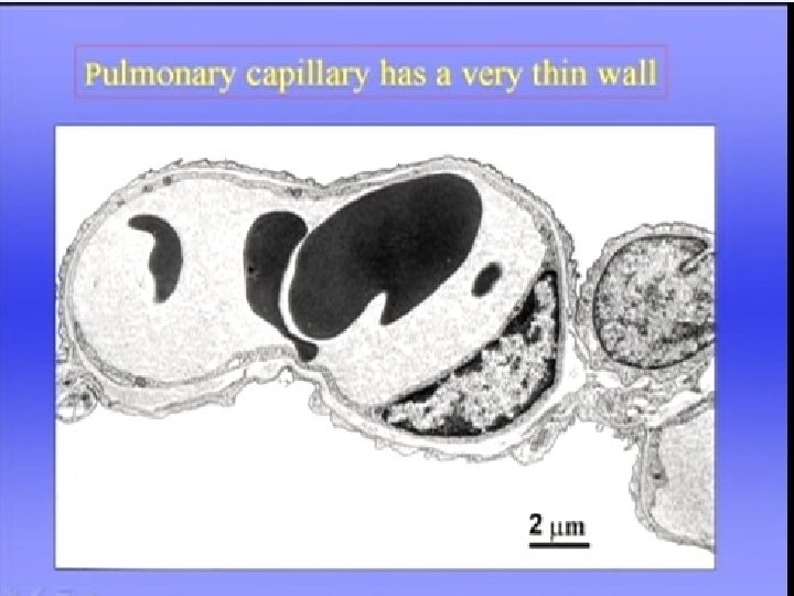 6. The capillary bed consists of extremely short, interconnected segments spreading 75 to 100 m. L of blood over a 70 -m 2 area, or about half the size of a tennis court. 7. the capillary bed as two sheets of endothelium held apart in places by posts, similar to an underground parking garage. Rather than flowing through numerous individual tubes (as in systemic capillaries), 8. pulmonary blood flows more like a sheet over the alveoli, maximizing its exposure to alveolar gases. This structural arrangement shortens the distance for oxygen and carbon dioxide diffusion between air and blood to one tenth of the diffusion distance that exists between systemic capillaries and tissue cells. 9. The thin walls of pulmonary vessels and vast area of the capillary bed make the pulmonary vasculature highly distensible compared with the systemic vasculature 10. The highly expandable pulmonary vascular bed serves as a backup reservoir that shields the left atrium from sudden changes in right ventricular output. If venous return to the right ventricle increases suddenly, as would occur during sudden strenuous exercise, left ventricular filling pressure increases gradually over two or three cardiac cycles rather than increasing abruptly.