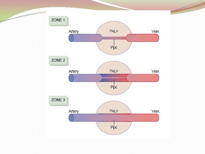 �Regional pulmonary blood flow : 1 -Zone 1: No blood flow (capill. pr. < alveol, pr. ) 2 -Zone 2: Intermittent blood flow 3 -Zone 3: Continuous blood flow. (capill. pr. > alveol. pr. ) �in normal lungs zone 1 cannot be found, zone 2 is in the apex of the lung and zone 3 represents the base.