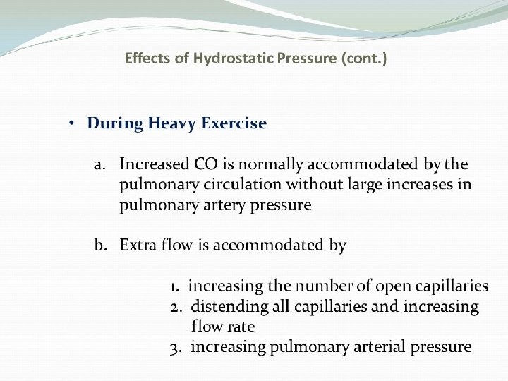Pulmonary Edema �Causes of pulmonary edema �left heart failure �damage to pulmonary blood cap membrane, as �In pneumonia or breathing chlorine gas or sulfur dioxide gas �Safety factor �negative interstitial pressure �lymphatic pumping �decreased interstitial osmotic pressure