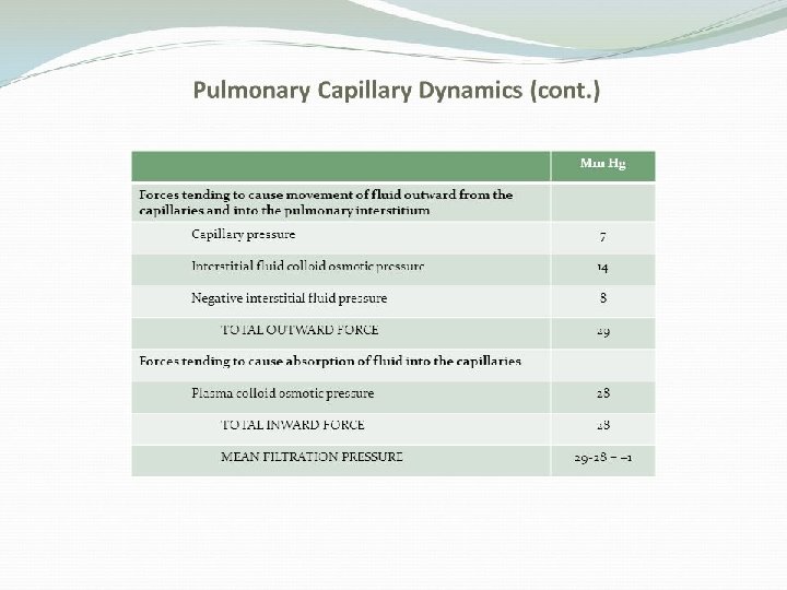Pulmonary Capillary Dynamics �Outward Forces �Pulmonary capillary pressure 7 mm. Hg �Interstitial osmotic pressure 14 mm. Hg �Negative interstitial pressure 8 mm. Hg �Total 29 mm. Hg �Inward Forces �Plasma osmotic pressure 28 mm. Hg �Net filtration pressure 1 mm. Hg �Negative interstitial pressure keeps alveoli dry