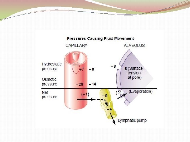 Pulmonary Capillary Dynamics Hydrostatic Osmotic +7 28 Net -8 -8 0 14 +1 surface tension hydrostatic pressure -5 Lymphatic pump