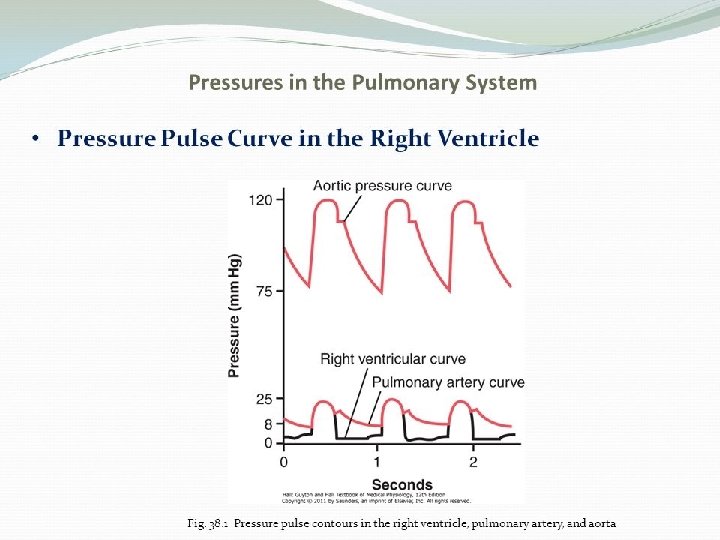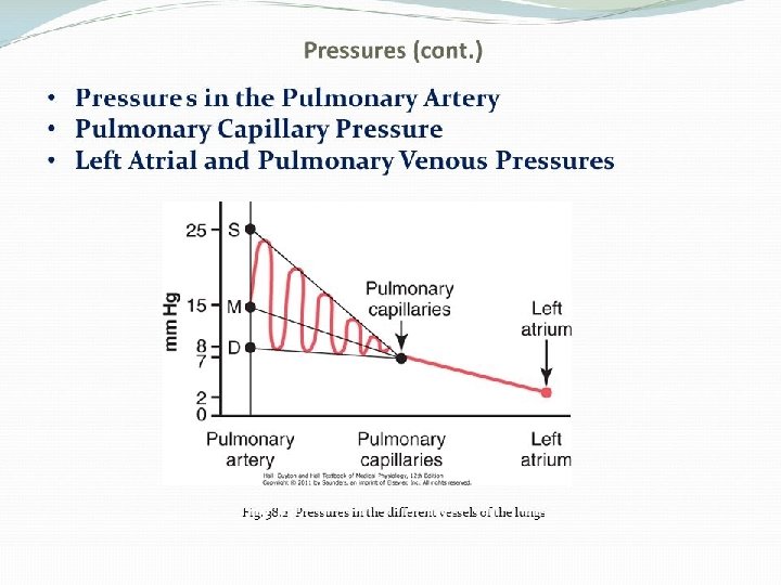 �Pressures in the pulmonary system: 1 - Right ventricle: 25 -1 mm. Hg 2 - Pulm. Artery: 25 -8 mm. Hg 3 - Pulm. cap. : 8 mm. Hg 4 - Left atrium & major veins: 2 mm. Hg 5 - Pulmonary wedge pressure about 5 mm hg. Increase in congestive heart failure � Blood volume of the lungs: : 450 ml ( 9% of total blood volume) 70 ml are found in the capillaries