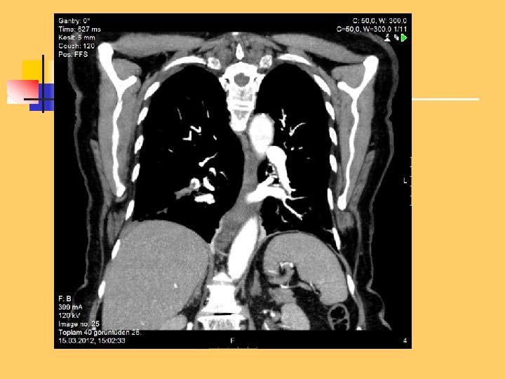 Diagnostic approach n n n n n Semptomatology and signs Chest radiology Arterial blood gas analysis (ABG) Electrocardiography Standard laboratory tests Echocardiography (Cardiac and venous doppler of the lower extremity) D-Dimer Spiral CT or Ventilation / perfusion scan Pulmoner angiography (gold standard)