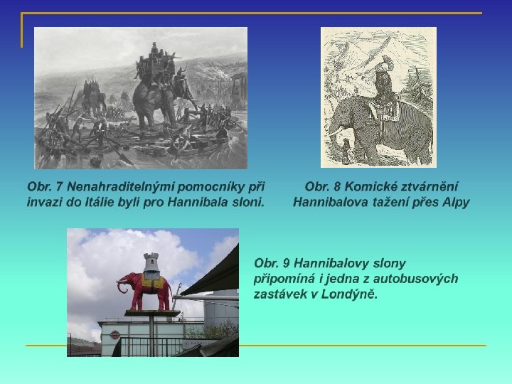 - při postupu přes Pyreneje k Alpám získá za spojence Galské kmeny Hannibalovi váleční sloni byli velmi silnou zbraní, krom nebezpečných klů poskytoval dřevěný můstek na hřbetě útočiště lučištníkům a oštěpařům AUTOR NEUVEDEN. http: //www. iulius. wz. cz/hannibal. htm [online]. [cit. 3. 4. 2013]. Dostupný na WWW: http: //www. google. com/598&q=Hanibal&#hl - na začátku výpravy čítala Hannibalova armáda 120 000 pěšáků, 16 000 jezdců a několik desítek válečných slonů na druhém konci velehor se mocná Kartágská armáda zmenšila na polovinu; z jednotky válečných slonů nezbylo dle pramenů ani 10 zvířat http: //www. youtube. com/watch? v=RU 9 v. R 6 EBE 50&feature=related