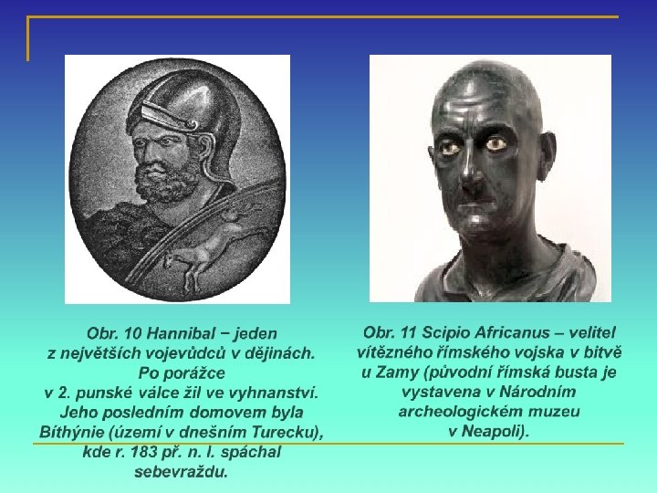 • Hannibal před Římem – Hannibal ante portas – zalekl se hradeb a nezaútočil – chyba! • Římané odmítají mír, dál bojují • (do armády přijímají i propuštěnce a zločince) • nakonec donutí Hannibala k návratu do Kartága • 202 př. Kr. bitva u Zamy – Hannibal poražen řím. vojevůdcem Scipiem Africanem Scipio Africanus