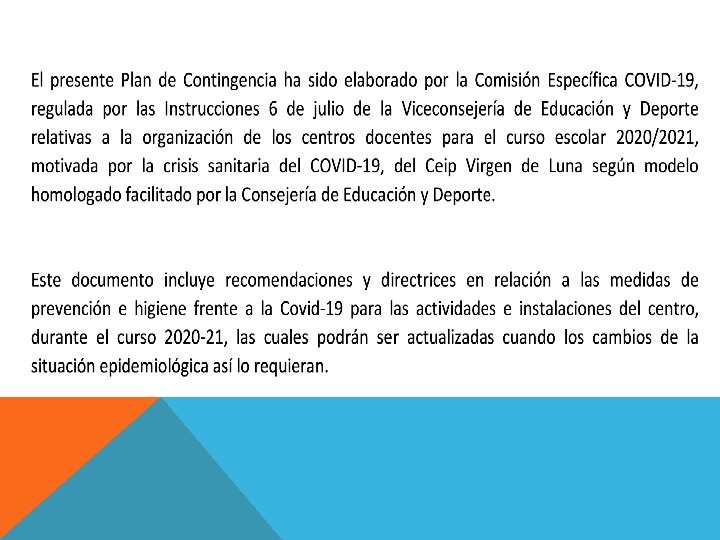 • Esperamos que esta presentación, de algunos de los puntos del protocolo COVID-19 elaborado por el C. E. I. P. Virgen de Luna, os hagan entender la importancia de la estrecha colaboración que debe existir entre todos los miembros de la Comunidad Educativa para afrontar este inicio de curso tan diferente y complicado, así como la comprensión de todas estas medidas que se han establecido para preservar la salud de todos y todas. • La necesidad de conocer, interiorizar y cumplir todas las normas establecidas en dicho protocolo es de vital importancia, de ahí, la responsabilidad de compartirlo con las familias y explicarlo más detalladamente en breve. • El Equipo Directivo , así como el Claustro de Profesores estamos a vuestra disposición para aclarar y consultar las dudas que se os planteen.