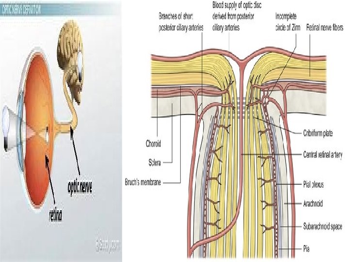 Optic nerve • The optic nerve is formed by the axons arising from the retinal ganglion cell layer , which form the nerve fibre layer of the retina (papillae). • The optic disc or nerve head is the point where the axons from the retinal ganglion cells leave the eye. • The nerve head appears as a white circular structure in the back of the eye. There are no photoreceptors on this structure. physiological blind spot. 1� • it passes out of the eye through the cribriform plate of the sclera. That allow the nerve fibers to pass through many holes and into the extraocular (outside of the eyeball) space. As the fibers pass through, they become covered by a sheath formed by dura , archnoid and pia , continuous with that surrounding the brain. It is bathed in CSF. • The central retinal vein and artery enter the eye in the center of the optic nerve