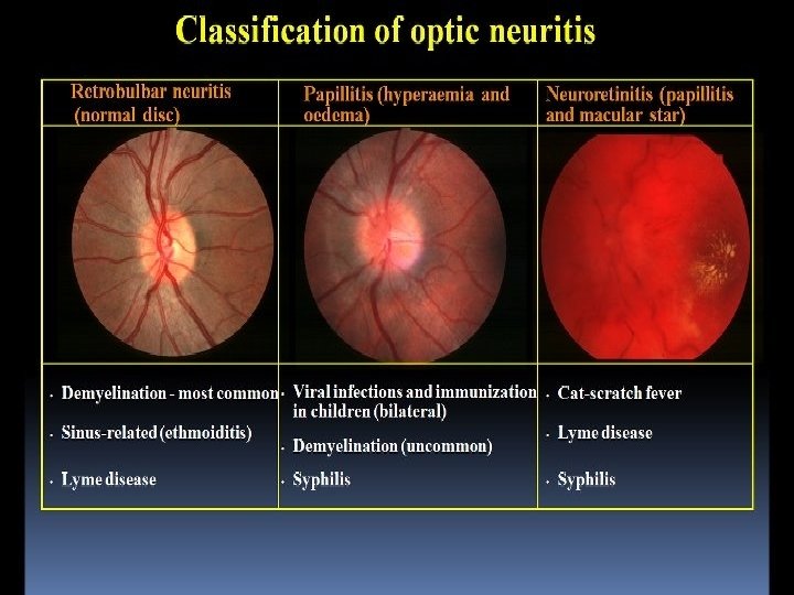 Causes: • Certain autoimmune diseases such as multiple sclerosis commonest cause 25% of MS patients come firstly with symptoms of ON • Infections such as viruses (especially in children), measles, meningitis, syphilis, sinusitis, tuberculosis, and human immunodeficiency virus (HIV) • Malnutrition. E. g. vit B complex deficiency. • Intraocular inflammation (uveitis)