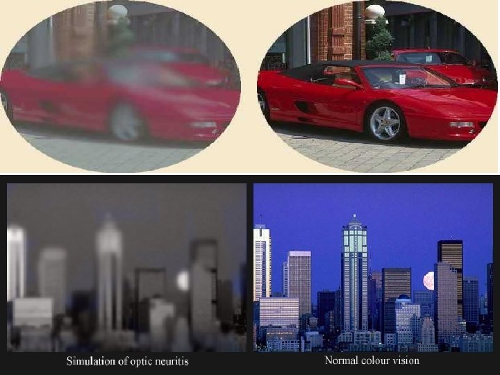Examination: • • Reduced VA , VF Reduced color vision Central scotoma and large blind spot RAPD –relative afferent pupillary defect- ( swinging flash light sign ) very important sign to diagnose Optic neuritis • Swollen OD in Papillitis • Normal OD in retrobulbar neuritis • Focal neurological signs in MS