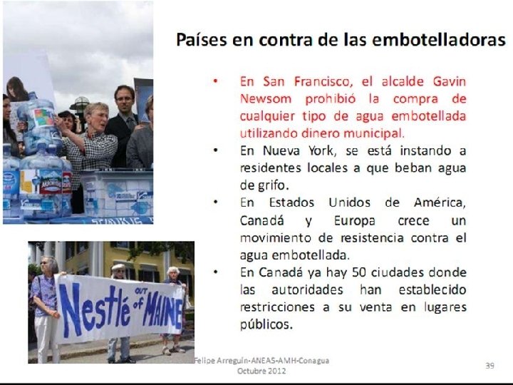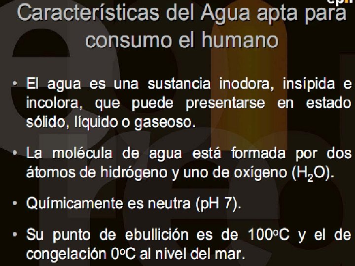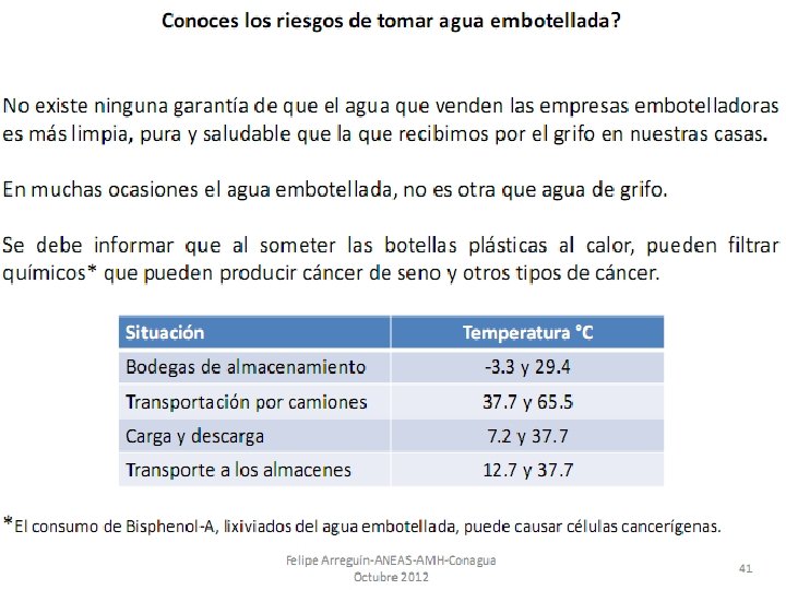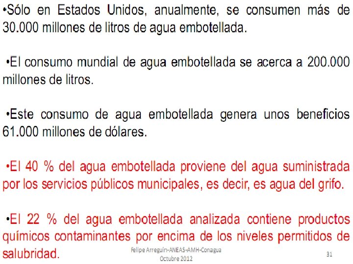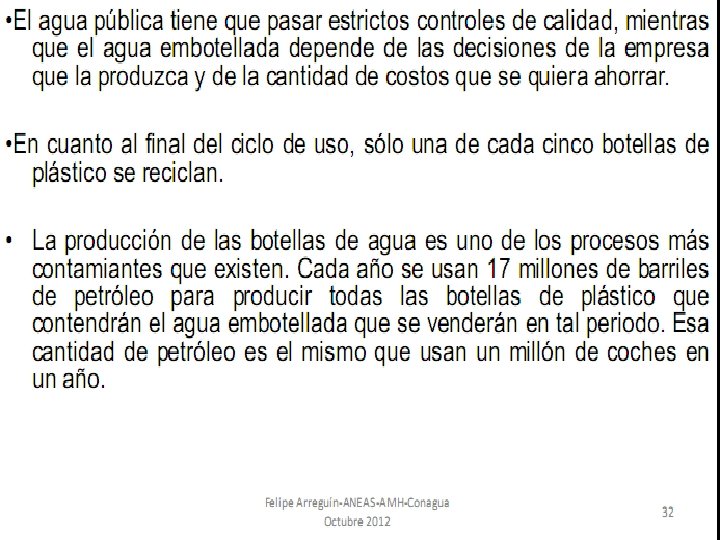 Purificación del agua Temario 1. El agua, Generalidades. 2. Propiedades del agua. 3. Potabilización del agua. 4. El agua embotellada, es necesaria? 5. El caso de México y las aguas embote lladas Dr. Leandro Alberto Páramo Aguilera lparamo 99@yahoo. com Tel. 87594165