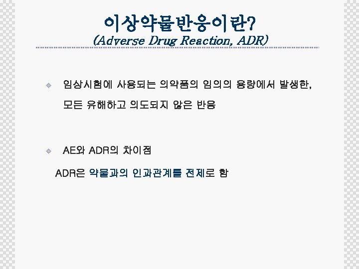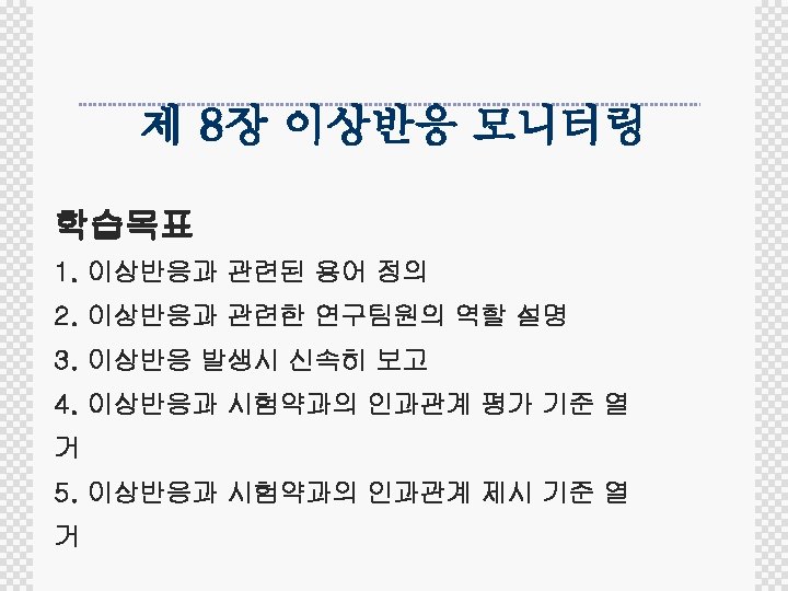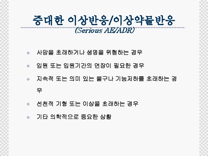 Flow of Safety Reporting Non-SAE Adverse Event YES No Expedited reporting Seriousness Unexpected ADR? Investigator SAE Investigational agent related? Investigators Sponsor CRF KFDA IRB