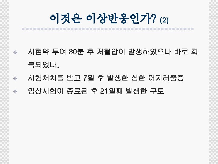 SADR reporting form (4) 03/03/06 ~ 03/14 CBC 호중구감소증 03/03/06 ~ 03/25 Chest PA 활동성 폐렴 03/03/07 Sputum culture Gram(+)