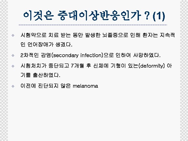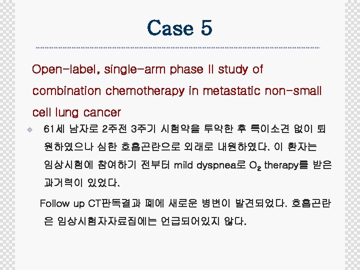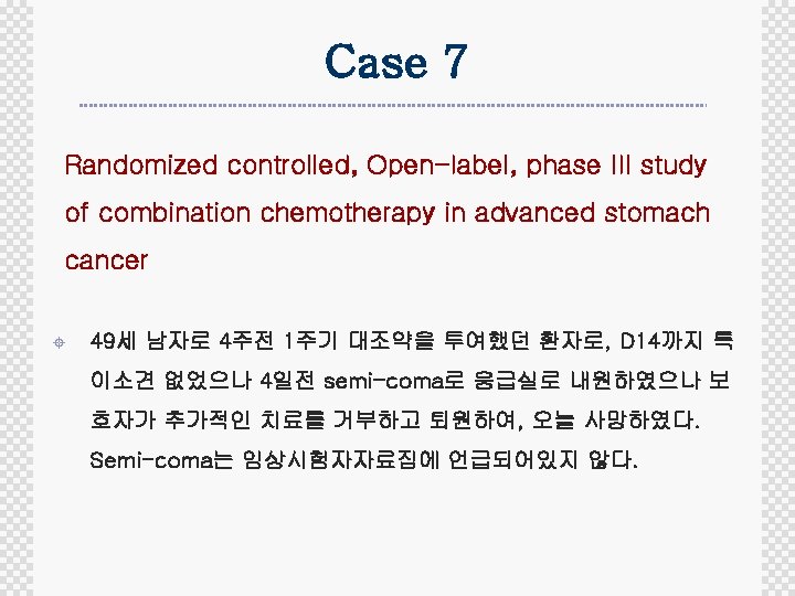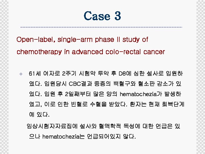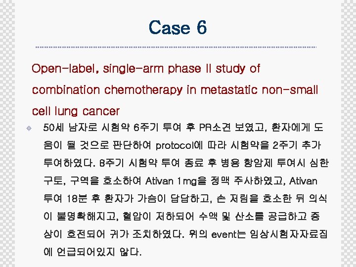 Case 8 Randomized controlled, Open-label, phase III study of combination chemotherapy in advanced stomach cancer ± 63세 여자로 10일 전 2주기 시험약을 투여한 후 D 5부터 중증 의 구토, 구역이 있어 입원하였으며, Renal tubular damage로 electrolyte unbalance와 중증의 leukopenia, thrombocytopenia를 보였다. Electrolyte교정과 GM-CSF투여 로 상태가 회복 중이다. 이 event는 임상시험자자료집에 언급 되어있다.