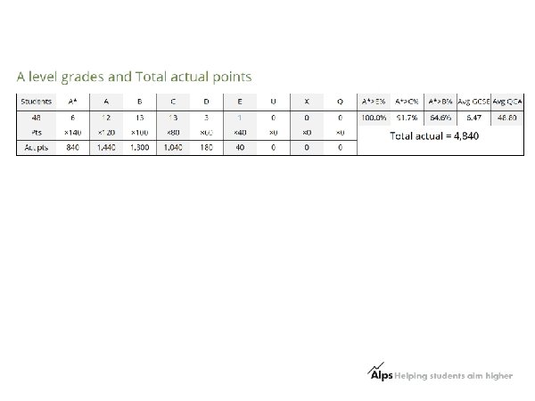 Alps helps to. . • Target our energies, working smarter not harder • Provide a consistent process with a culture of aspiration for both students and staff • To take appropriate actions with individuals and groups of students • Give a common language for everyone: students, teachers, tutors, leaders at all levels and governors