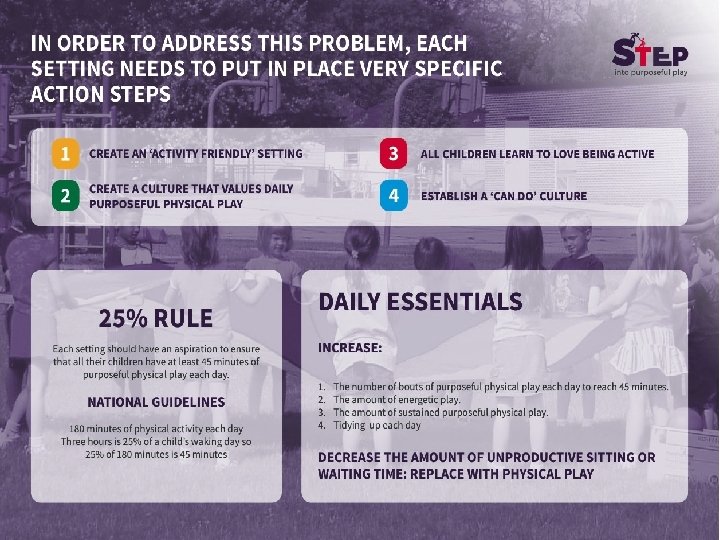 In the Early Years there is a lack of understanding of the role for Purposeful Physical Play because there is NO: 1. Clear VISION of what could be done. 2. SENSE OF DIRECTION of what needs to be done 3. Sharp FOCUS on what can be achieved 4. Sense of what needs to be planned and organised