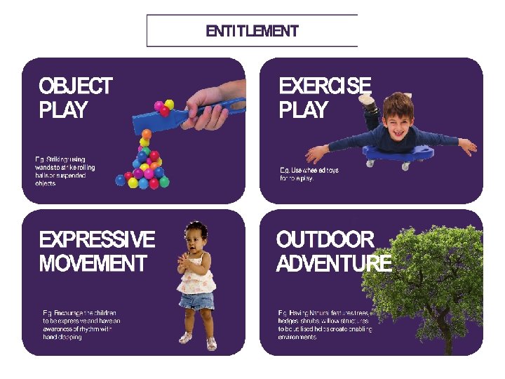 Positive Culture in every Setting • Create an “activity friendly” setting in which provision (space) is made for daily opportunities for purposeful physical play and any inhibiting factors are removed. • Create a culture within the setting that recognises the need for all practitioners to value daily purposeful physical play as an entitlement for all children. • Ensure that all children are given the opportunity to learn to love being active: • Inclusive pedagogy. • Establish a “Can Do” culture within the setting in which all practitioners adopt an enabling attitude when promoting daily purposeful physical play