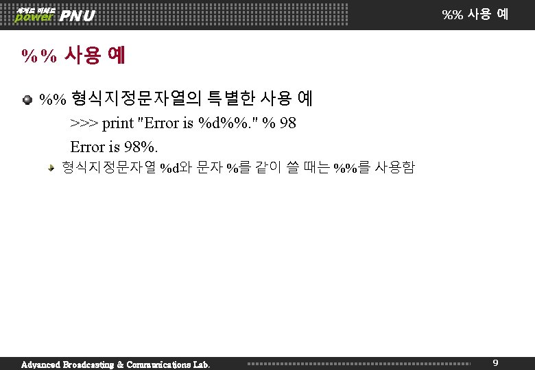 세계로 미래로 power PNU 형식지정문자열 요약 형식지정문자열 %s %c %d %f %o %x %% 뜻 문자열(string) 문자 한 개(character) 정수(integer) 부동소수점수(floating-point number) 8진수(octal number) 16진수(hexadecimal number) 문자 '%' 자체(literal %) Advanced Broadcasting & Communications Lab. 7