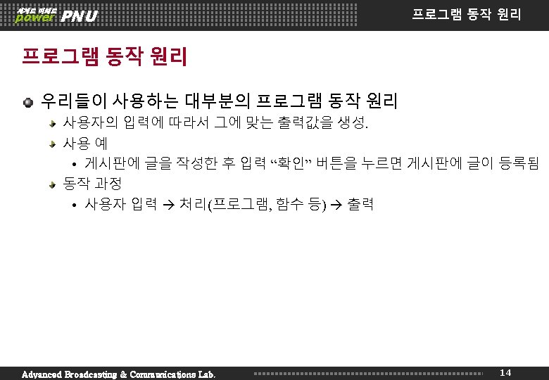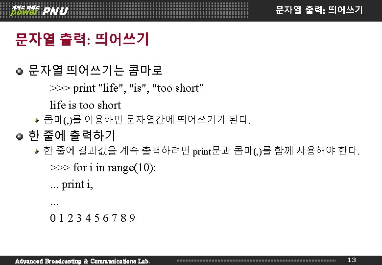 세계로 미래로 power PNU 문자열 출력: 접합하여 출력 단순 병치(①)와 + 연산자 (②) >>> print "life" "is" "too short" ---------- ① lifeistoo short >>> print "life"+"is"+"too short" ---------- ② lifeistoo short 따옴표(")로 둘러싸인 문자열은 + 연산과 동일 Advanced Broadcasting & Communications Lab. 12