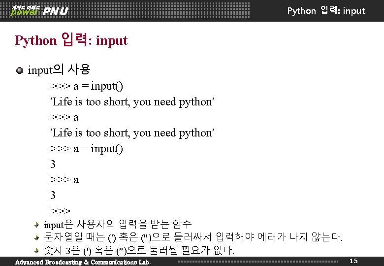 세계로 미래로 power PNU 입력 오류 input()이 잘못 사용된 예제 >>> a = input() you need python Traceback (most recent call last): File "", line 1, in ? File "", line 1 you need python ^ Syntax. Error: invalid syntax 위처럼 you need python 을 변수에 입력하듯이 'you need python'처럼 ''로 감싸주 지 않았을 때는 에러가 발생함. Advanced Broadcasting & Communications Lab. 16
