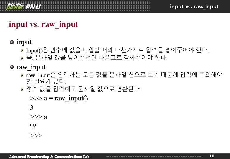 세계로 미래로 power PNU Python 입력: raw_input 사용 예 >>> a = raw_input() Life is too short, you need python >>> a 'Life is too short, you need python' >>> raw_input()에서는 문자열을 입력할 때 (')나 (")을 필요로 하지 않는다. raw_input은 입력되는 모든 것을 문자열로 취급한다. Advanced Broadcasting & Communications Lab. 17
