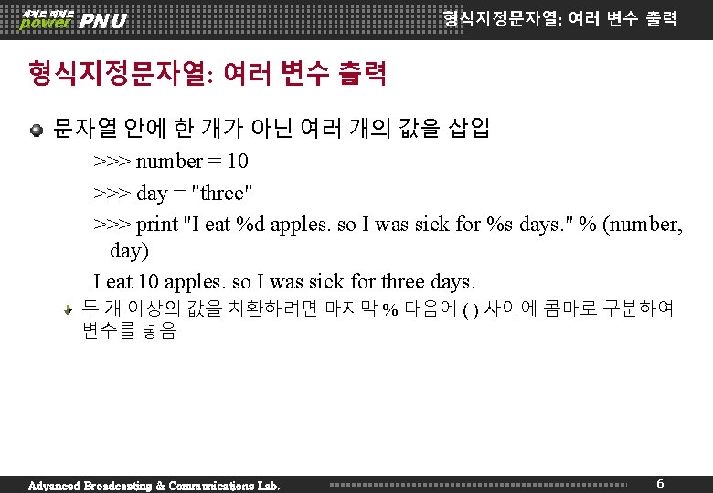 세계로 미래로 power PNU 형식지정문자열: 변수 값 출력 숫자를 변수로 대입 후 출력 >>> number = 3 >>> print "I eat %d apples. " % number I eat 3 apples. Number에 3을 대입한 후 출력함 Advanced Broadcasting & Communications Lab. 5