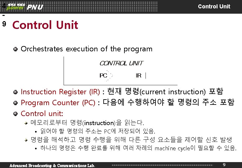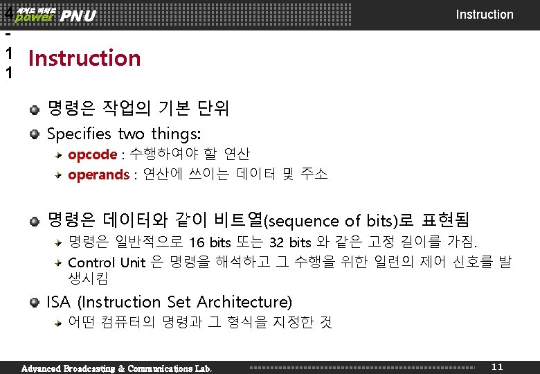 4 power PNU 1 0 세계로 미래로 Instruction Processing Fetch instruction from memory Decode instruction Evaluate address Fetch operands from memory Execute operation Store result Advanced Broadcasting & Communications Lab. 10