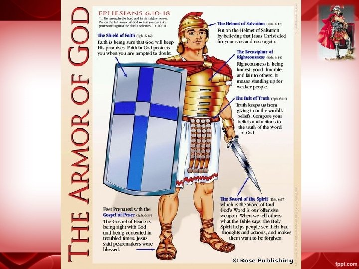 Ephesian 6: 10 -18 • Eph 6: 14 Stand therefore, having your loins girt about with truth, and having on the breastplate of righteousness; • Eph 6: 15 And your feet shod with the preparation of the gospel of peace; • Eph 6: 16 Above all, taking the shield of faith, wherewith ye shall be able to quench all the fiery darts of the wicked. • Eph 6: 17 And take the helmet of salvation, and the sword of the Spirit, which is the word of God: • Eph 6: 18 Praying always with all prayer and supplication in the Spirit, and watching thereunto with all