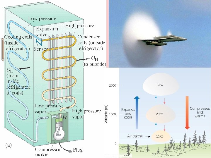 Pressure Adiabatic (no heat flow) processes Volume Adiabatic expansion: (Q = 0) Work is done by the gas (+W) No heat flows in: Q = U + W 0 = U + W, U = -W Internal energy (T) drops Examples Air rockets Cold side of fridge Universe Demo - cloud