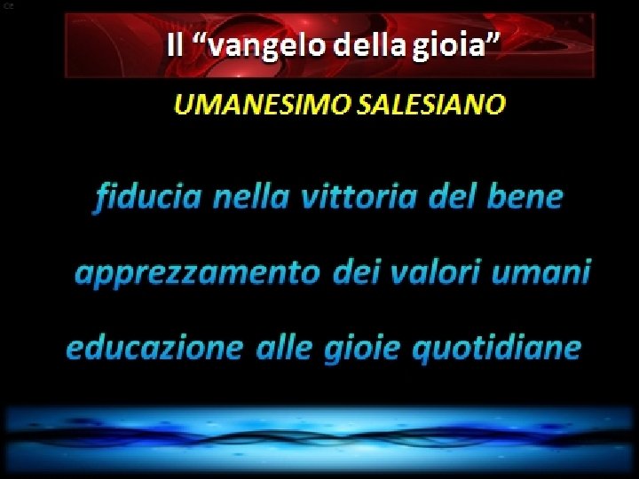 VOCAZIONE Il profilo del Salesiano Cooperatore • Una persona ricca di umanità elemento tipico dell’ umanesimo di San Francesco di Sales • Un battezzato con inmenso amore alla Chiesa, discepolo di Gesù, inserito nelle realtà temporali con una identità chiara e prassi di vita cristiana • Un salesiano nel mondo, secondo l’ intuizione originale di don Bosco che lo voleva un appassionato collaboratore di Dio attraverso le grandi scelte della missione salesiana : la famiglia, i giovani, l’ educazione, il sistema preventivo, la responsabilità sociale e politica
