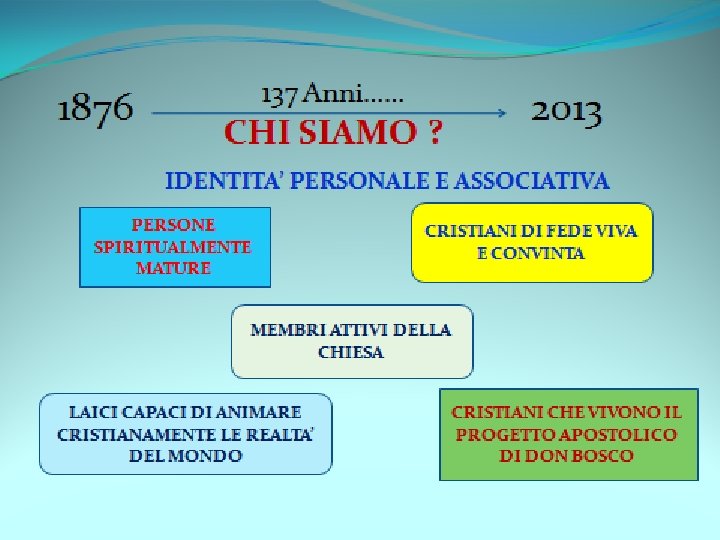 PVA un momento storico v 1876 Decreto di fondazione del primo Regolamento ufficiale della Pia Associazione. Don Bosco sottolinea il senso apostolico dell’Associazione. v 1914 -1963 -1972 Si affievolisce lo spirito apostolico dell’Associazione. v 1963 -65 Concilio Vaticano II chiede la revisione e la rivitalizzazione dello spirito originale di tutte le Istituzioni della Chiesa.